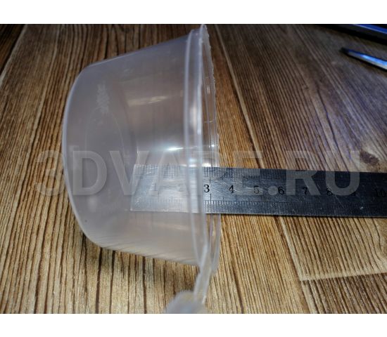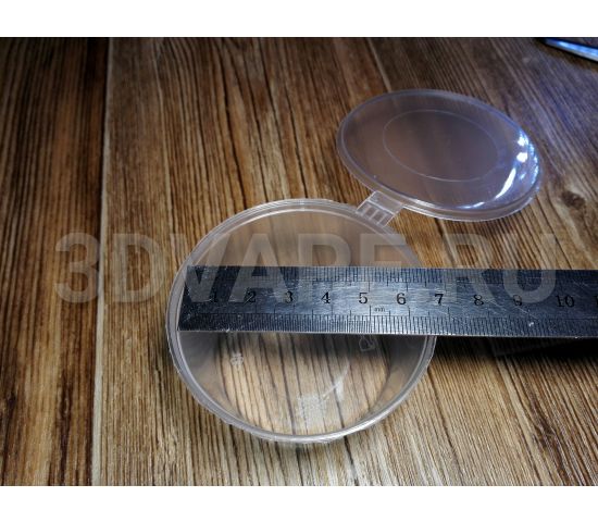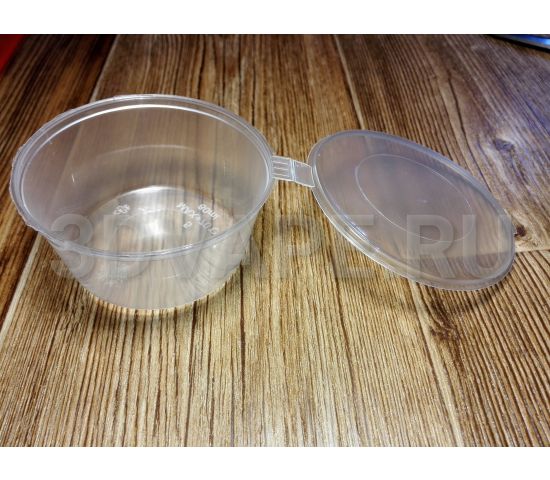 A bottle of transparent plastic with a sealed cover. Food plastic - PP (PP) polypropylene. Height 30 mm, diameter 55/65 mm Production - Russia